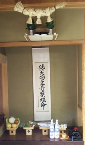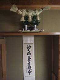 神棚とトラは、当屋になる時作る。神箱と掛け軸は4月の当屋渡しの日に引き継ぐ。この掛け軸は大神神社元宮司・中山和敬氏の手による。越権宮