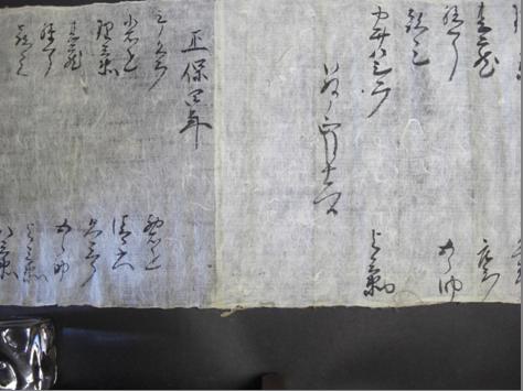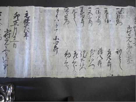 『北村心経会之事 箕倉殿 九衛門 形部殿 孫九郎 与一郎 与五郎 衛門 善四郎 右近 才二郎 粥柱 与八郎 元和四年 戊午 正月十二日』