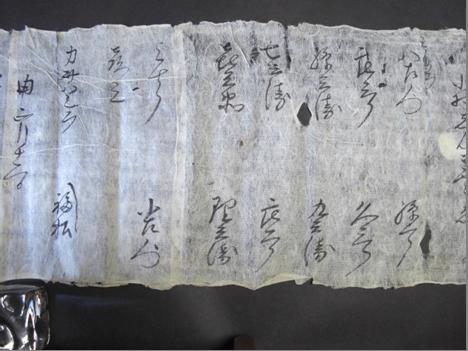 般若心経を読誦していたのであろう。ミノクラトノだけが苗字で書かれているが、大神神社の5社家の1であったからだろう。あとの8人は百姓で名前のみ。キヤウチヨは