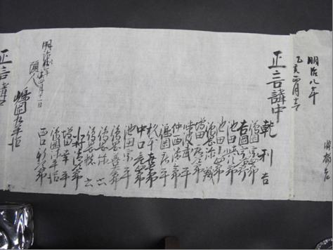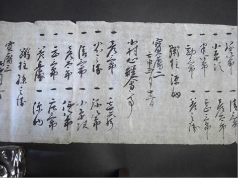 『北村心経会之事 箕倉主殿 弥五郎 嘉兵衛 庄次郎 武助 彦七 作兵衛 彦四郎 善蔵 弥三郎 弥助 九右衛門 彦三郎 宗次郎 粥柱 小四郎 倅新右衛門 文政弐夘 正月十二日』