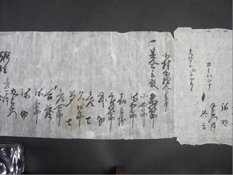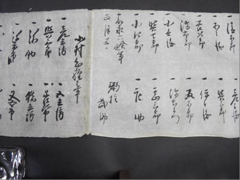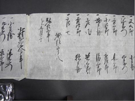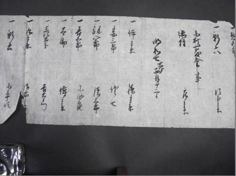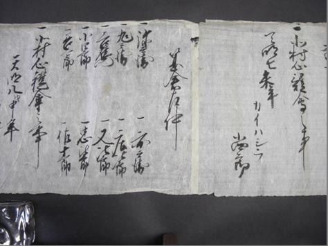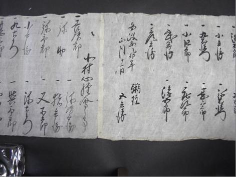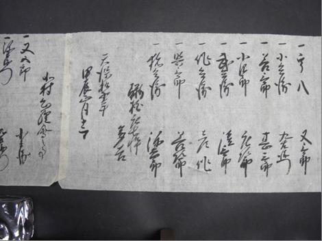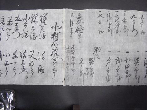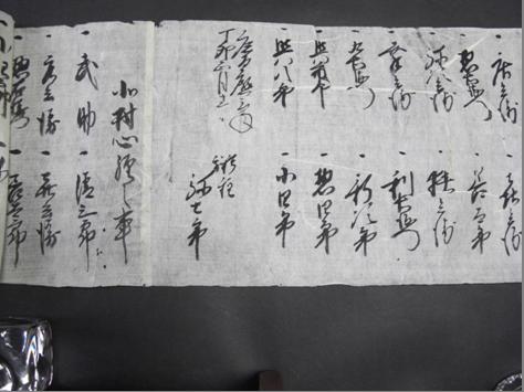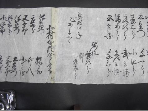 北村サシチヤウノ事 ミノクラトノ キヤウフ キタエモン タツミエモン セイ六 才一郎 ヨ八郎 作兵衛 マコ助 ヨ五郎 才二郎 マコ九郎 西ウコ カ井ハシラ キ