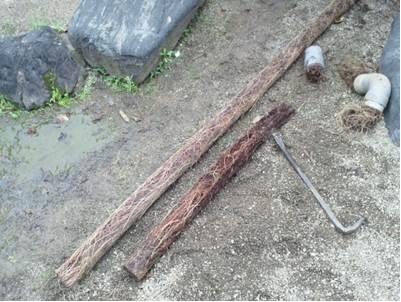 床下を通り、庭を縦断している排水管、切断したら出てきたのが、この写真の杉の根、5m以上あった。築40年、台杉も当初から庭木として植栽していたのだが。いつ頃から侵入したのか、