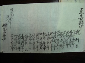 そして、この行事を行った証明書として、神社が参加者名を書き、箕倉氏に渡した。(既成事実の積み上げと上級講員扱いの証として名を書き記した)